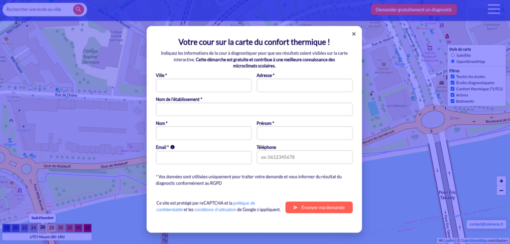 Dans ce contexte, une carte interactive a été développée par SOLENEOS pour faciliter l’analyse du confort thermique des cours d’école et proposer un outil partagé d’aide à la compréhension et à la décision.